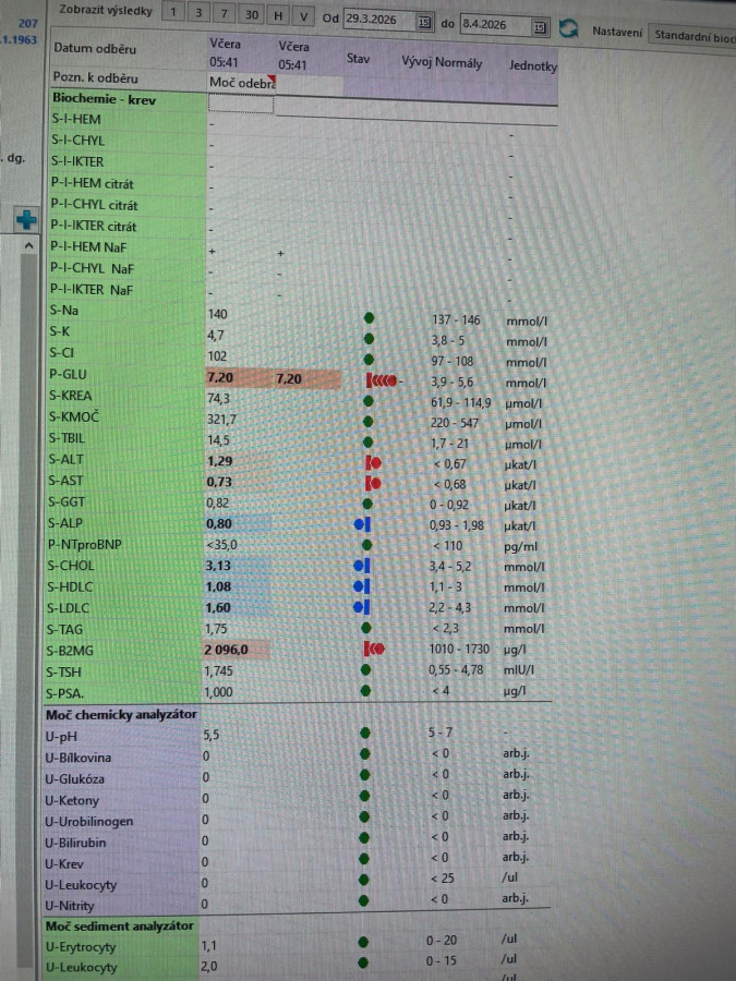 Dobrý den, prosím o radu. Předem se omlouvám za možná trapný dotaz, ale řeším danou situaci v praxi poprvé. Mému pacientovi byl při preventivní prohlídce (působím jako VPL) v laboratoři omylem stanoven B2MG (místo mikroalbuminurie) - a vyšel nám zvýšený. Vzhledem k anamnéze pacienta (hůře komp. DM, hypertenze,…) se přikláním spíše k možné počáteční renální insuficienci, přesto bych byla ráda za konzultaci výsledku. Je hodnota hodně zvýšená a mohla by ukazovat i na nějaké hematologické onemocnění, např.myelom? (Je léčen pro osteoporózu). Mám s odstupem nějak zkontrolovat? Subj. si pacient stěžuje jen na mírnou únavu, neguje ztrátu váhy, noční poty či bolesti kostí. Přikládám anamnézu, laboratoř. Předem moc děkuji za Váš čas a přeji hezké jarní dny.