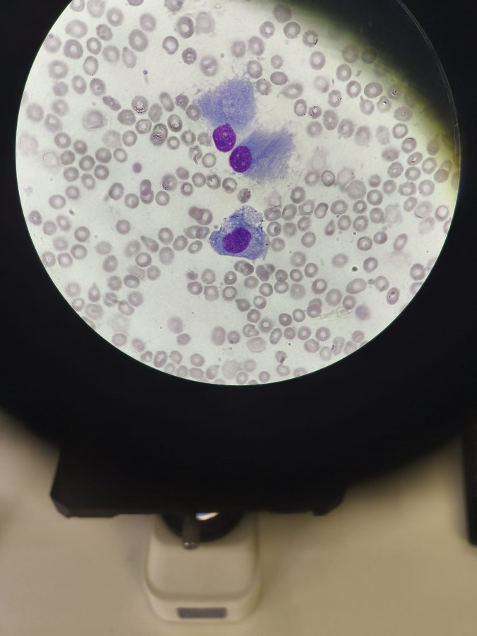 Vazeni kolegovia, prosime o radu u 62 rocneho pacienta s RRMM, u ktoreho bol v ramci 4. liniovej liecby zahajeny talquetamab. Ide o pacienta s opak. extramedularnymi relapsami, aj v ramci poslednej progresie, navyse u pacienta bola vstupne pritomna leukocytoza, avsak bez plazmocytov (Leu cez 30 G/l, s vyraznou eozinofiliou 75%, anemia a Tr-penia Tr 30 G/l). Vys. KD - 100% myelomova infiltracia. Vzhladom k velkej nadorovej mase sme pred bispecifickou protilatkou podali debulking jednorazovo cyklofosfamid 500 mg/m2 + dexametazon s vyraznou redukciou leukocytozy a eozinofilie. Nasledne podane 3x SUD talquetamabu s profylaktickym tocilizumabom. U pacienta 2.den po 3.SUD rozvoj febrilit + elevovaneho CRP, zvladnuteho podanim dexametazonu a sirokospektralnou ATB liecbou. Pacient je vsak t.c. mesiac od podania cyklofosfamidu a 3 tyzdne po 3.SUD, aj napriek dennej stimulacii G-CSF a hemosubstitucii - pretrvava tazka pancytopenia (Leu 0,04, Hb 79, Tr 15), CRP negativne, klinicky v dobrom stave. Pre pancytopeniu realizovane kontrolne vys. KD - sucha punkcia, imprint s hypocelularnymi natermi, pritomne atypicke bunky - vid obrazok.