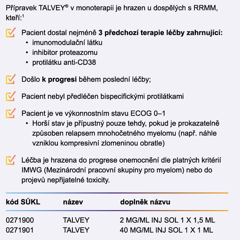 Léčivý přípravek TALVEY®  je od 1. 11. 2025 v České republice hrazen z veřejného zdravotního pojištění pro léčbu dospělých pacientů s relabujícím nebo refrakterním mnohočetným myelomem.1