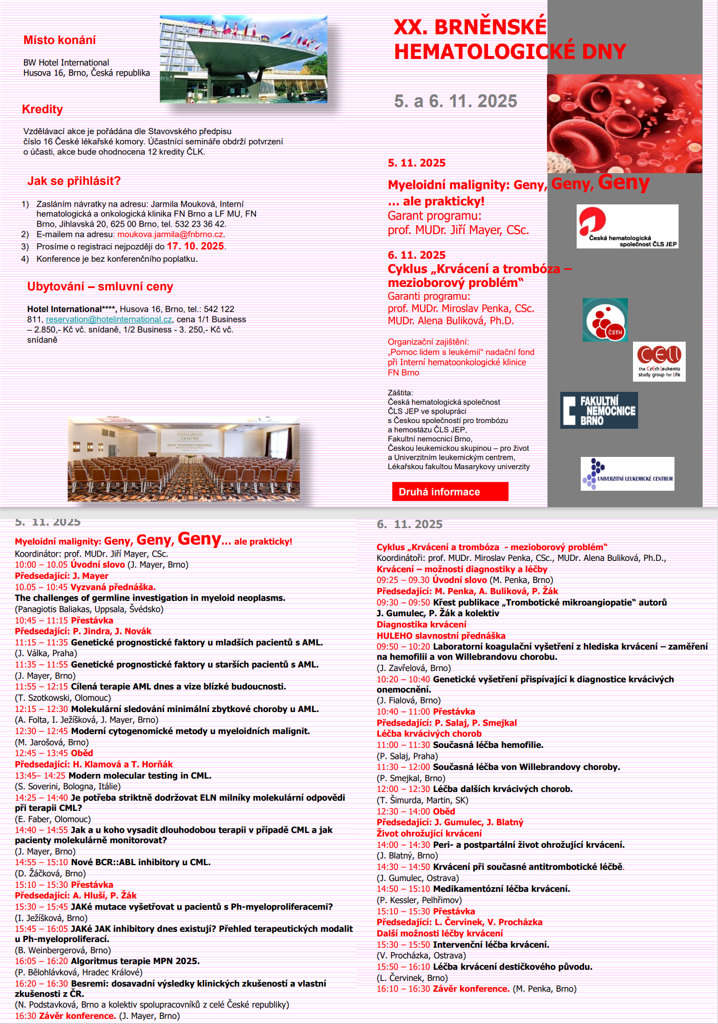 Dovolujeme si Vás informovat, že ve dnech 5. a 6. listopadu 2025 se v BW Hotelu International v Brně uskuteční jubilejní XX. Brněnské hematologické dny. Jde o tradiční odborné setkání pořádané Nadačním fondem „Pomoc lidem s leukémií“ při Interní hematologické a onkologické klinice FN Brno a LF MU.